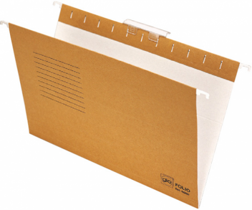Carpeta colgante de visor superior fabricada en Kraft 250 g./m2. Varilla de acero con terminal nylon o varilla de plástico. Lomo en V. Visor móvil de 8 cm.