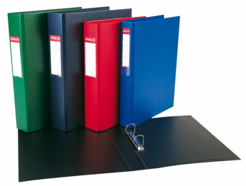 Carpetas de anillas fabricadas en cartón forrado de plástico tanto en el exterior como en el interior, 2 y 4 anillas mixtas de 25 mm. y 40 mm. de diámetro, con tarjetero en el lomo. Tamaño folio.