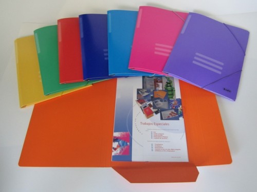 Carpetas de gomas fabricadas en cartón con tres solapas y cierre con gomas en colores diversos. Tamaño Folio.