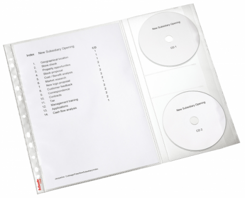 Funda dossier multitaladro de polipropileno desplegable con compartimentos para documentos y 2 CD’s. En bolsa de 5 fundas.