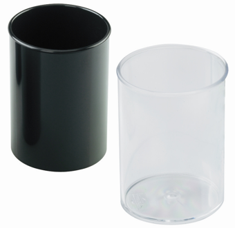 Portalápices redondo en colores negro y transparente de gran capacidad. Medida: 70x105 mm.