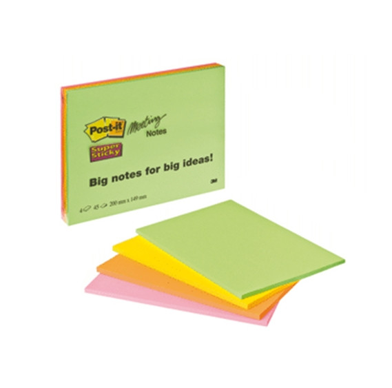 Pack 4 Blocs Notas Post-it Super Sticky 200x149 mm. Neón Liso. Colores surtidos: amarillo, naranja, fucsia y verde neón. 45 hojas/bloc.