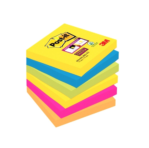 Pack de 6 blocs de notas Post-it® Súper Sticky de 90 hojas colores amarillo neón, azul mediterráneo, verde neón, amarillo neón, rosa fucsia y naranja neón.