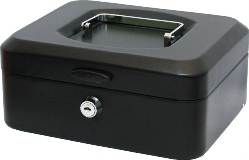 Caja de caudales con bandeja. Fabricada en metal, con asa y llave. Bandeja interior extraíble. Permite clasificar monedas y billetes. Incluye llave.