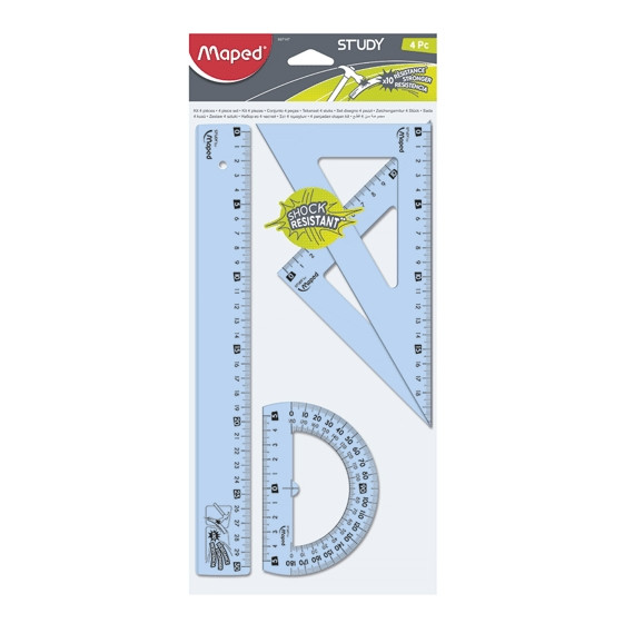 Estuche de reglas flexibles compuesto por escuadra y cartabón de 21 cm, semicírculo de 180º, y reglas de 30 cm.