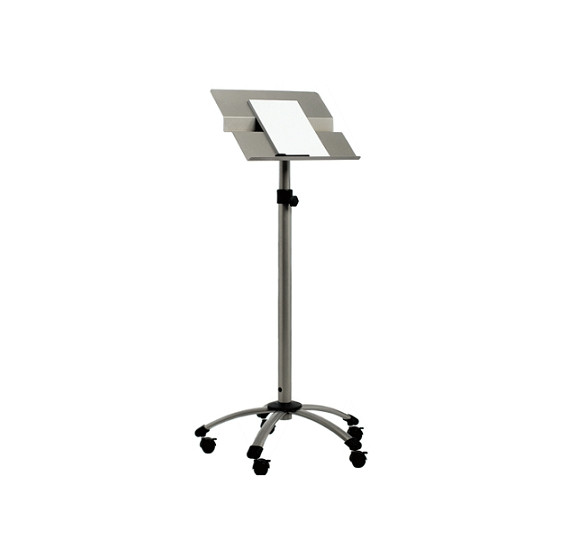 Atril móvil para presentaciones económico. Fabricado en plancha de acero pintado en exposy gris mate. Regulable en altura.