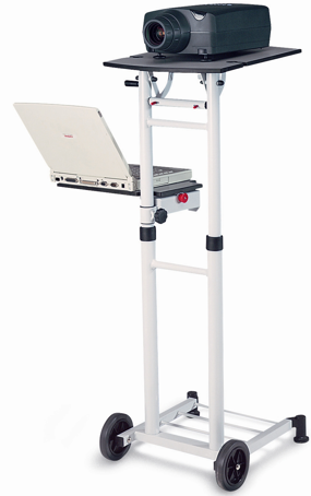 Mesa para videoproyección profesional desarrollada específicamente para facilitar las presentaciones itinerantes: sirve como carro para el transporte de equipos, y en el momento de la presentación se convierte en pocos segundos en una mesa de proyección. Montaje muy sencillo. Ligero pero seguro. En posición plegada ocupa muy poco espacio. Dos funciones en una: mesa y carro. Plataformas plegables y regulables en altura (uno para el proyector y otra para ordenador). Color blanco. Ruedas robustas.