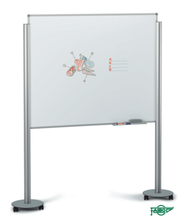 Funcional diseño, que permite ensamblar pizarras o tableros de corcho a la altura deseada, sin necesidad de ninguna manipulación en los mismos. Adaptables a todas las pizarras y tableros de corcho con marco de aluminio de nuestro catálogo. Conjunto de dos soportes de 1950 mm de altura, en aluminio anodizado color plata, con base metálica de 300 mm de diámetro y 6 mm de espesor, lacada en color gris. Se suministra con los elementos para regular la altura de la pizarra o tablero. Con tres ruedas con freno.