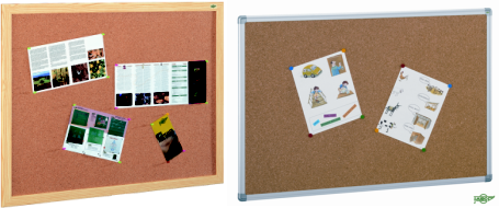 Tablero de anuncios de corcho en marco de fibra melaminada y de aluminio.