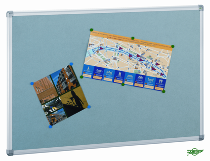 Tablero de corcho tapizado en tres colores para sujección de anuncios y trabajos.
