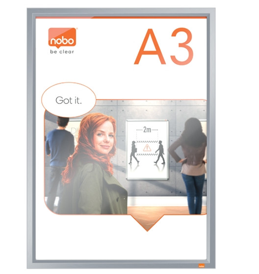Marco Clip Impression Pro Nobo. Disponibles en tamaño A3 acabado plata-grafito. Innovadora sustitución de contenidos clic. Cambio de contenido rápido y sencillo. Montaje en pared. Marco estrecho y moderno. Esquinas biseladas. Solución de señalización estable y segura.