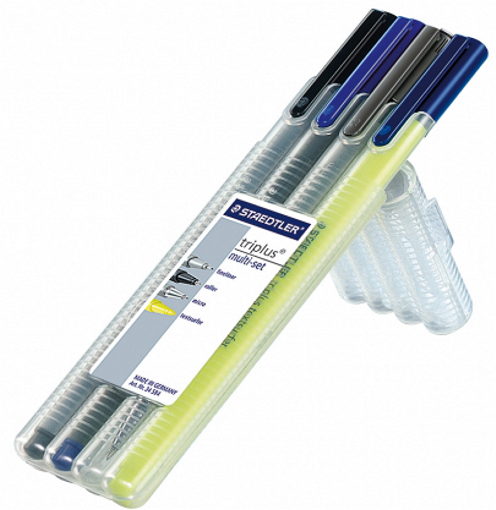 Estuche rígido de 4 rollers colores rojo, azul, verde y negro de diseño triangular ergonómico con capuchón y clip. Punta de bola de 0,3 mm.
