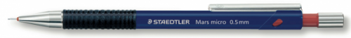 Portaminas con punta retráctil, mina amortiguada, empuñadura de caucho, pulsor, clip y punta metálica. Disponible en 3 anchos de línea.