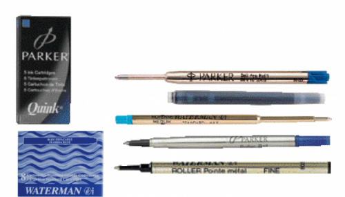 Recambios de escritura para Parker y Waterman compuesto de barras para bolígrafo y roller y cartuchos para pluma.