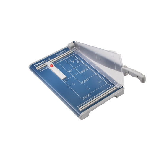 Cizalla hasta A4. longitud de corte de 340 mm.y 2,5 mm. de capacidad (25 hojas 80 g.). Mesa metálica de 450x285 mm. con esquinas redondeadas y patas de goma antideslizantes. Prácticos asideros para transporte seguro. Líneas de formato DIN impresas en la mesa. Mango ergonómico. Cuchilla de acero de alta calidad de Solingen. Sólido contrafilo de acero macizo. Protector de cuchilla translúcido. Prensado manual. Dos topes angulares con escalado en mm. Tope posterior regulable.