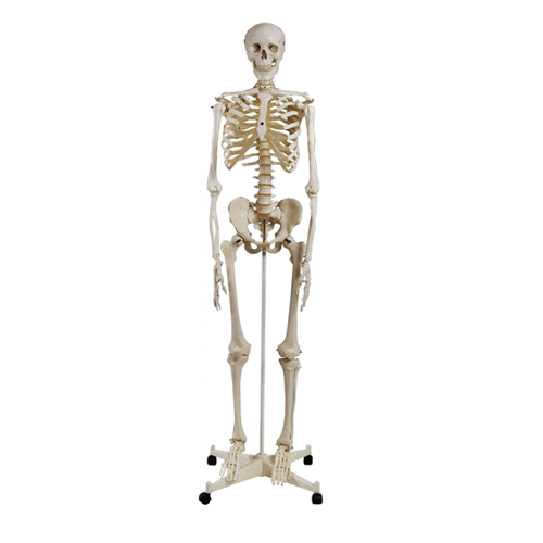 Tamaño natural adulto, cráneo seccionado y desmontable en 3 componentes, reproducción imitando fisuras y detalles de los huesos. Extremidades articulables. Soporte con ruedas.