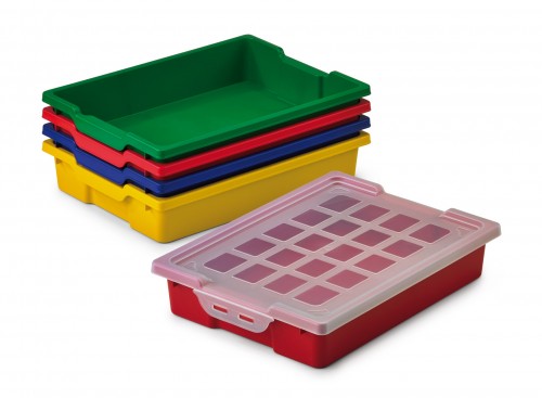 Caja de polipropileno con tapa en cuatro colores y dos medidas de altura 7,3 y 14,8 cm. Medidas: 42x31cm.