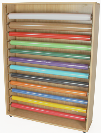 Mueble para el almacenaje y exposición de rollos de papel. Fabricado en melamina de haya, con tableros de 19mm de espesor, excepto trasera de 10mm cantos de PVC de 2mm, acabado por las dos caras. Acoples en el interior de los laterales, para el soporte de los rollos, de DM melaminizado de 16mm de grosor con cantos redondeados y barnizados con barniz no tóxico. Pies niveladores de PVC de 4cm de diámetro, con opción de dos alturas (4 y 8 cm.), para evitar la humedad y desniveles que pueda tener el suelo. Con capacidad de 12 rollos de papel de 25 ó 50 metros. Incluye 12 soportes de tubo portarrollos en PVC de 2cm de diámetro. Este mueble debe ser atornillado a la pared. Medidas 111cm. (ancho) x 147cm. (alto) x 40cm. (fondo). Color Haya