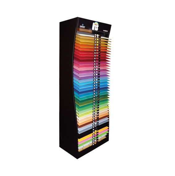 Expositor de 42 Baldas. Ordenación Cromática. Primera balda (cartulina blanca) de doble altura mayor capacidad de carga. Color negro. Contiene 1150 hojas de cartulina. 25 hojas x 41 colores incluyendo 4 colores flúorescentes, mas dos de metalizados y 50 hojas en los colores , blanco , negro, azul claro y rojo.