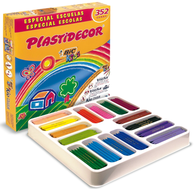 Caja con bandeja de plástico termoformado para contener, ordenar y reponer todas las piezas. Contenido 352 ceras Plastidecor: 16 Colores x 22 unidades. Nuevo envase 88% de cartón Reciclado