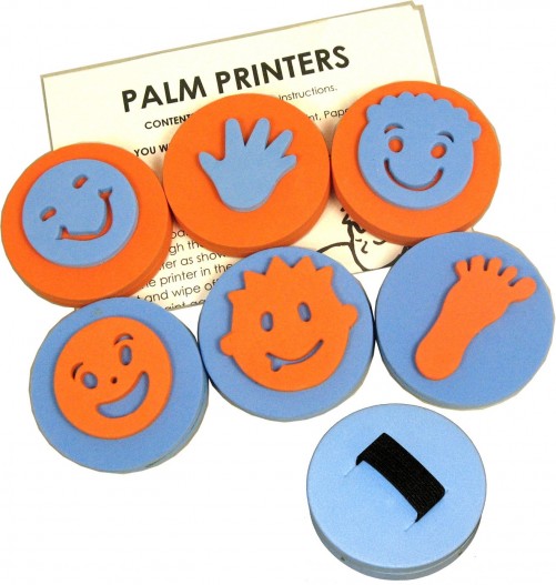 Bolsa de 6 esponjas con cuatro caras diferentes, la mano y el pie. Lleva una cinta elástica en el dorso para colocar la mano y así hacer estampaciones más comodamente