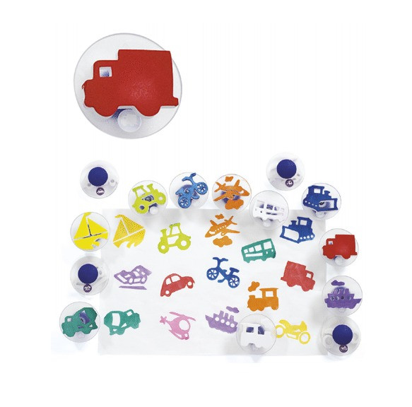 Set 14 sellos, de distintos modelos de transporte con empuñadura de agarre para su fácil estampación. Base transparente de plástico, que ayuda a los niños a ver exactamente donde están estampando. La espuma se fija firmemente a la manija plástica robusta. Sin látex. Medida 7,5 cm.