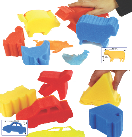 Pack compuestos por 5 esponjas grandes fabricadas en material de alta densidad con grosor de 48 mm. Disponible en dos colecciones distintas: Transporte y Animales.