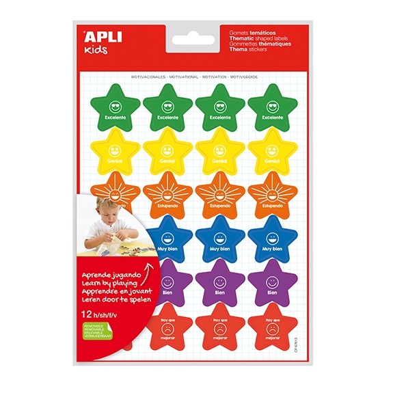 Bolsa de gomets motivacionales con adhesivo removible. Cada bolsa contiene 12hojas, un total de 288 gomets por bolsa. Cada bolsa contiene 6 estilos de estrellas con frases motivacionales y colores distintos. Cada hoja contiene 4 estrelllas de cada color/frase.