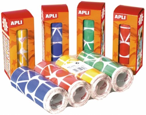 Rollos de gomets tamaños grandes para los más pequeños. Cada rollo de 8,8 m contiene las figuras de rectángulo, triángulo, círculo y cuadrado en 1 mismo color.