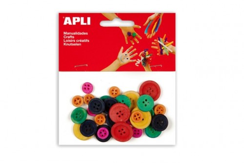 Bolsa de 30 botones de madera en colores surtidos y tamaños diferentes.