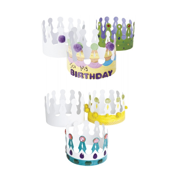 Coronas de cartón para decorar con gran variedad de materiales ideal para celebraciones. Son ajustables. Medida: 61 largo x 12,7 cm ancho. Bolsa de 24 unidades