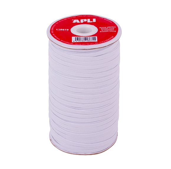 Bobina de cuerda elástica plana tamaño 5 mm. x 100 m. en color blanco. Producto duradero, flexible y fácil de cortar y atar. Ideal para usar en tus manualidades: máscaras, pulseras, collares, disfraces, etc.