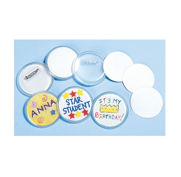Crea tus propias chapas. Decora en un circulo de papel y cúbrelo con los botones de plástico. El pack incluye 24 chapas de plástico reutlizables y 48 círculos de papel. Las chapas tienen 6,4 cm. de diámetro. Se recomienda su uso para mayores de 5 años bajo la supervisión de un adulto ya que la chapa lleva imperdible en la parte trasera.