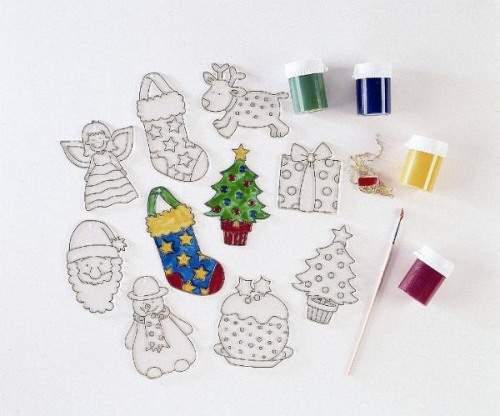 Bolsa de 24 figuras navideñas de metacrilato transparente, para realizar móviles o pintar con pinturas de cristal, rotuladores, etc...Incluye 4 botes de pintura cristal + pincel.