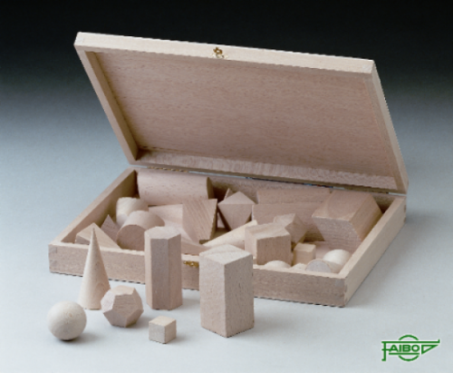 Caja que contiene 28 cuerpos geométricos de 4 cm de madera. Contiene folleto instructivo.