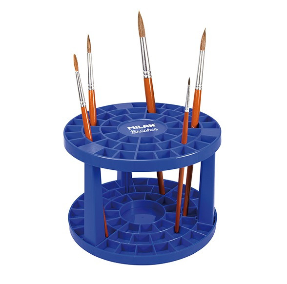 Práctico soporte para 49 pinceles, muy útil para secarlos y ordenarlos.Colocar los pinceles en posición vertical con el pelo hacia arriba, paraproteger el pelo y mantener la forma. Fácil de ensamblar. Consta de 1 base, 1 círculo divisor y 3 patas. Medidas (una vez montado): 14,5 cm. dediámetro y 10 cm. alto.
