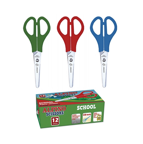 Tijera escolar de 13 cm.de acero inoxidable. Punta roma y mango de plástico.