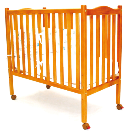Cuna de madera de pino 100x50 cm. Lateral abatible. Dispone de 4 ruedas giratorias, 2 con freno. Somier de láminas extrafuerte. Gatera. Barníz atóxico. Ideal para espacios reducidos.