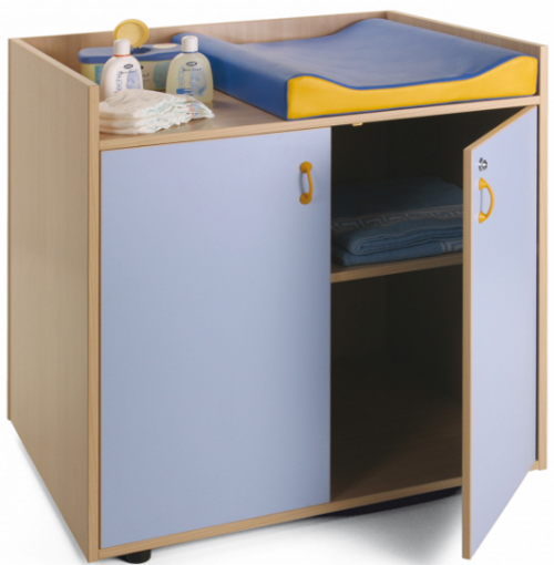 Mueble cambiador con dos estantes fabricado en melamina de haya y cantos de PVC de 2 MM. Pies niveladores de 4 cm. Estructura en color haya. Baldas y puertas en blanco, amarillo, naranja, rojo, rosa, azul claro, azul , verde manzana, verde y haya.. Dimens