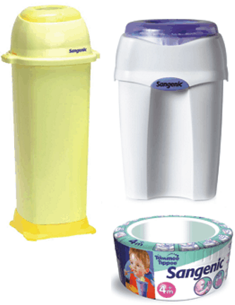 Contenedor higiénico antibacterias para pañales que no permite la salida de malos olores. Disponible en dos tamaños, tamaño grande con capacidad para 40 pañales y el contenedor pequeño o doméstico tiene una capacidad de unos 28 pañales. De práctico uso, el contenedor tiene una cassette de recambio que una vez llena se anuda y se tira directamente a la basura. La cassette de recambio tiene una capacidad aproximada de 180 usos.