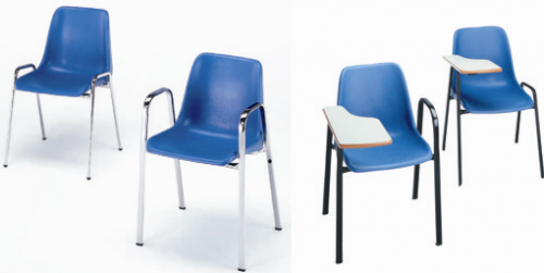Silla carcasa de polipropileno en blanco, crema, naranja, marrón, gris, rojo, verde, azul o negro. Pala en blanco, crema, verde ministerio, arena o gris. Fija, 4 apoyos. Acabado cromado y pintada epoxy negro. 2 brazos.