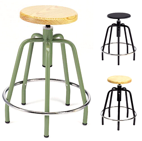 Taburete con asiento giratorio regulable en altura de estructura metálica con asiento en madera de pino barnizada..