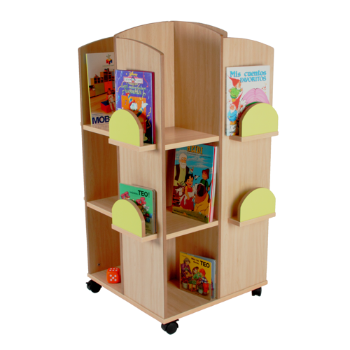 Expositor de libros accesible por los cuatro lados, cada lado esta formado por zona estantería para el almacenaje de libros y zona expositor, donde exponer los libros de frente. Ancho 57, fondo 57 y alto 119 cm.