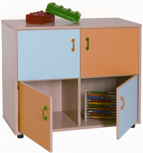 Armario con cuatro puertas y cuatro casillas. Medidas: 90 cm. (anchura) x 76,5 cm. (altura) x 40 cm. (profundo). Puertas interiores antiatrapamiento de dedos.
