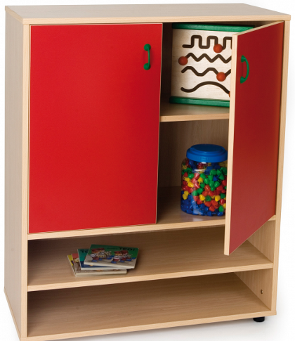 Armario alto y estantería baja con 2 estantes cada uno. Puertas interiores antiatrapamiento de dedos. Medidas: ancho 90 cm x alto 112 cm x profundo 40 cm.