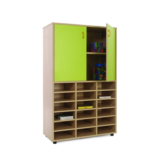 Mueble compuesto por casillero inferior con 18 casillas y armario con 2 estantes en la parte superior, fabricado en melamina de haya de 19 mm. de grosor, excepto trasera de 10 mm. Cantos de PVC de 2 mm. acabados por las dos caras. Pies niveladores de PVC de 4 cm. de diámetro y 4 cm. de altura, para evitar la humedad y desniveles que pueda tener el suelo. Estos pies pueden ser retirados para poder superponer sobre diferentes armarios, o bien ser sustituidos por ruedas con freno de 6 cm. de altura. PUERTAS INTERIORES ANTIATRAPAMIENTO DE DEDOS EN SU CIERRE y tiradores de polímero suave (goma antigolpes). Garantizado por los ensayos realizados en centro tecnológico de certificación de mobiliario TECNALIA. El mobiliario se pide por encargo y no es susceptible de devolución. Para casos excepcionales consultar condiciones.