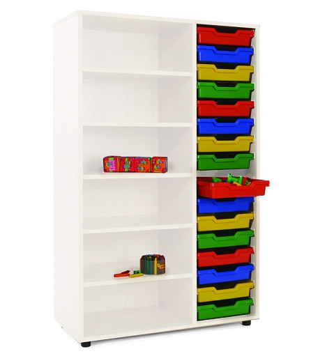 Mueble compuesto por armario inferior con 2 estantes y estantería de 3 estantes con 1 columna de cubetas en la parte superior, fabricado en melamina blanca de 19 mm de grosor, excepto trasera de 10 mm. Cantos de PVC de 2 mm. acabados por las dos caras. Pies niveladores de PVC de 4 cm. de diámetro y 4 cm. de altura, para evitar la humedad y desniveles que pueda tener el suelo. Estos pies pueden ser retirados para poder superponer sobre diferentes armarios, o bien ser sustituidos por ruedas con freno de 6 cm. de altura. Garantizado por los ensayos realizados en centro tecnológico de certificación de mobiliario TECNALIA. CUBETAS INCLUIDAS. El mobiliario se pide por encargo y no es susceptible de devolución. Para casos excepcionales consultar condiciones.