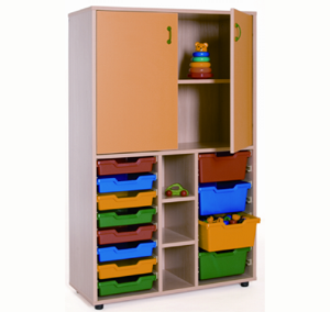 Armario con dos puertas altas, dos estantes y cubetas. Puertas interiores antiatrapamiento de dedos. Medidas: 90 cm (anchura) x 147 cm (altura) x 40 cm (profundo).