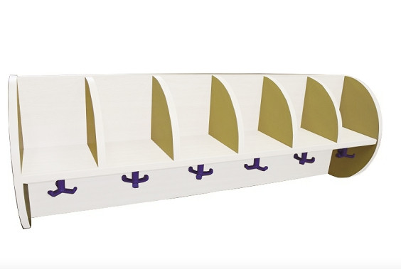 Mueble casillero con 6 casillas de separaciones redondeadas y extremos en forma de semicírculo, fabricado en melamina blanca, con tablero de 19 mm. separadores de casillas y trasera de 19 mm., para ofrecer mayor rigidez, estabilidad y sujeción, cantos de PVC de 2 mm. Dispone de 6 perchas giratorias fabricadas en polipropileno con aristas redondeadas y sistema triple colgador, para poder colgar la vestimenta del niño. Garantizado por los ensayos realizados en centro tecnológico de certificación de mobiliario TECNALIA. Dimensiones: Ancho/Alto/Fondo: 119/42/22 cm. Colores de estructura: blanco, amarillo, naranja, rojo, rosa, azul claro, azul oscuro, verde manzana verde oscuro, haya. El mobiliario se pide por encargo y no es susceptible de devolución. Para casos excepcionales consultar condiciones.