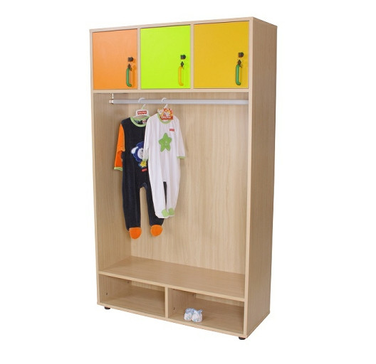 Perchero abierto con barra central con sistema anticaída. Con tres puertas superiores con cerradura para guardar objetos personales y dos casillas bajas para zapatos, que a su vez servirá de banco para los más pequeños. Fabricado en melamina de haya, con tableros de 19 mm. de espesor, excepto trasera de 10 mm; puertas de 16 mm.y cantos de PVC de 2 mm., acabado por las dos caras. Pies niveladores de PVC de 4 cm. de diámetro, con opción de dos alturas (4 y 8 cm.), para evitar la humedad y desniveles que pueda tener el suelo. PUERTAS INTERIORES ANTIATRAPAMIENTO DE DEDOS EN SU CIERRE y tiradores de polímero suave (goma) (anti golpes). Garantizado por los ensayos realizados en centro tecnológico de certificación de mobiliario TECNALIA. Dimensiones: Ancho/Alto/Fondo: 105/180/40 cm. El mobiliario se pide por encargo y no es susceptible de devolución. Para casos excepcionales consultar condiciones.